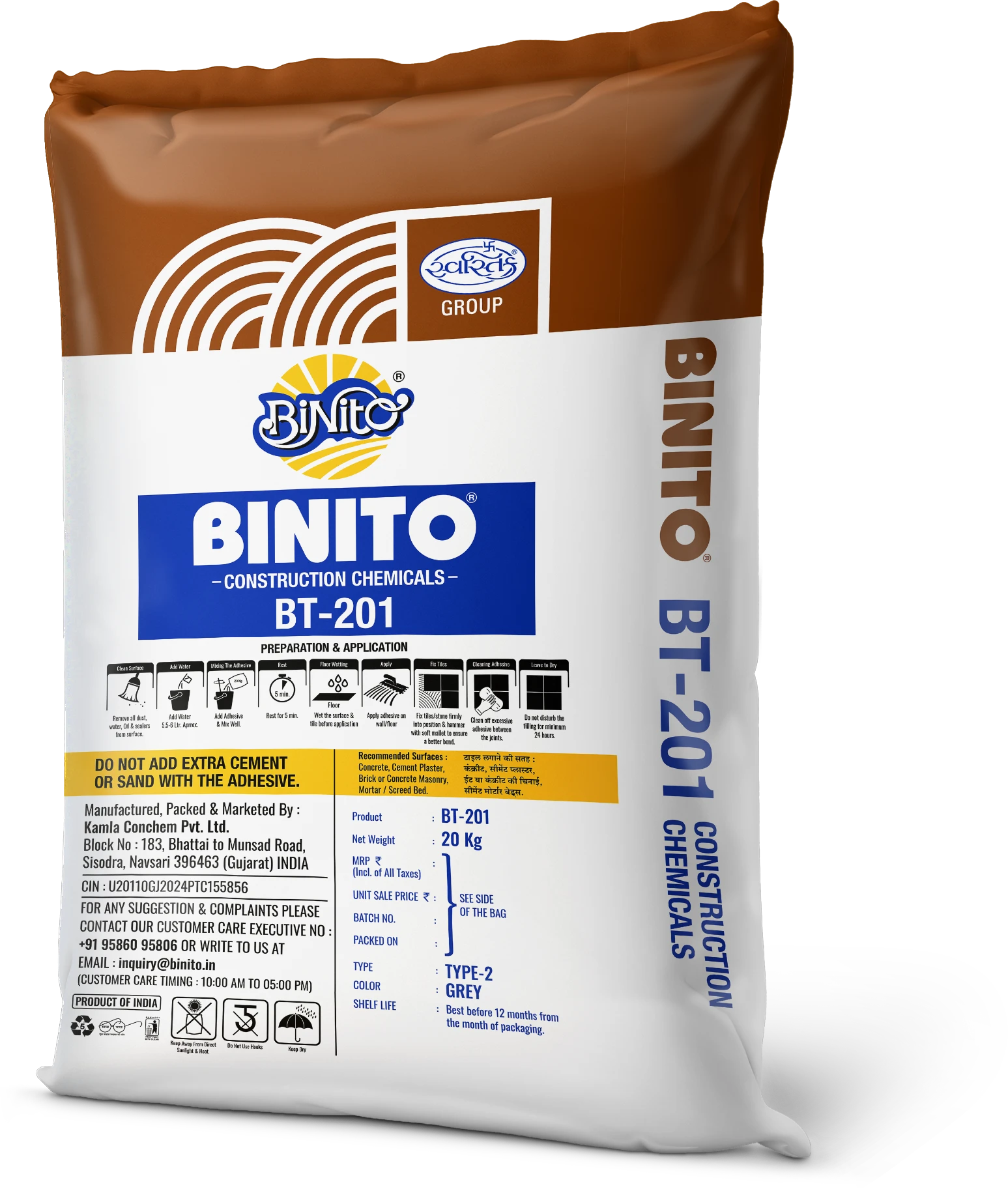 Binito BT-201 is a Type-2 tile adhesive with a C2T classification designed for superior bonding performance. It is formulated for ceramic, vitrified and glass mosaic tiles, providing strong adhesion for indoor and outdoor applications. This adhesive is ideal for areas exposed to moderate moisture and temperature changes.